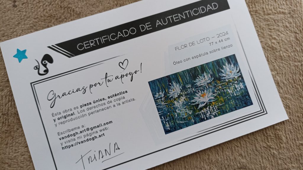 Todas mis obras se envían acompañadas de un certificado de autenticidad en donde se avala que cada pieza es única, auténtica e irrepetible.